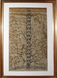 Rappresentazione su carta dell'albero genealogico della famiglia Nesini, incorniciata e coperta da vetro. In basso, ai piedi dell'albero, uno stemma e un cartiglio con scritta.