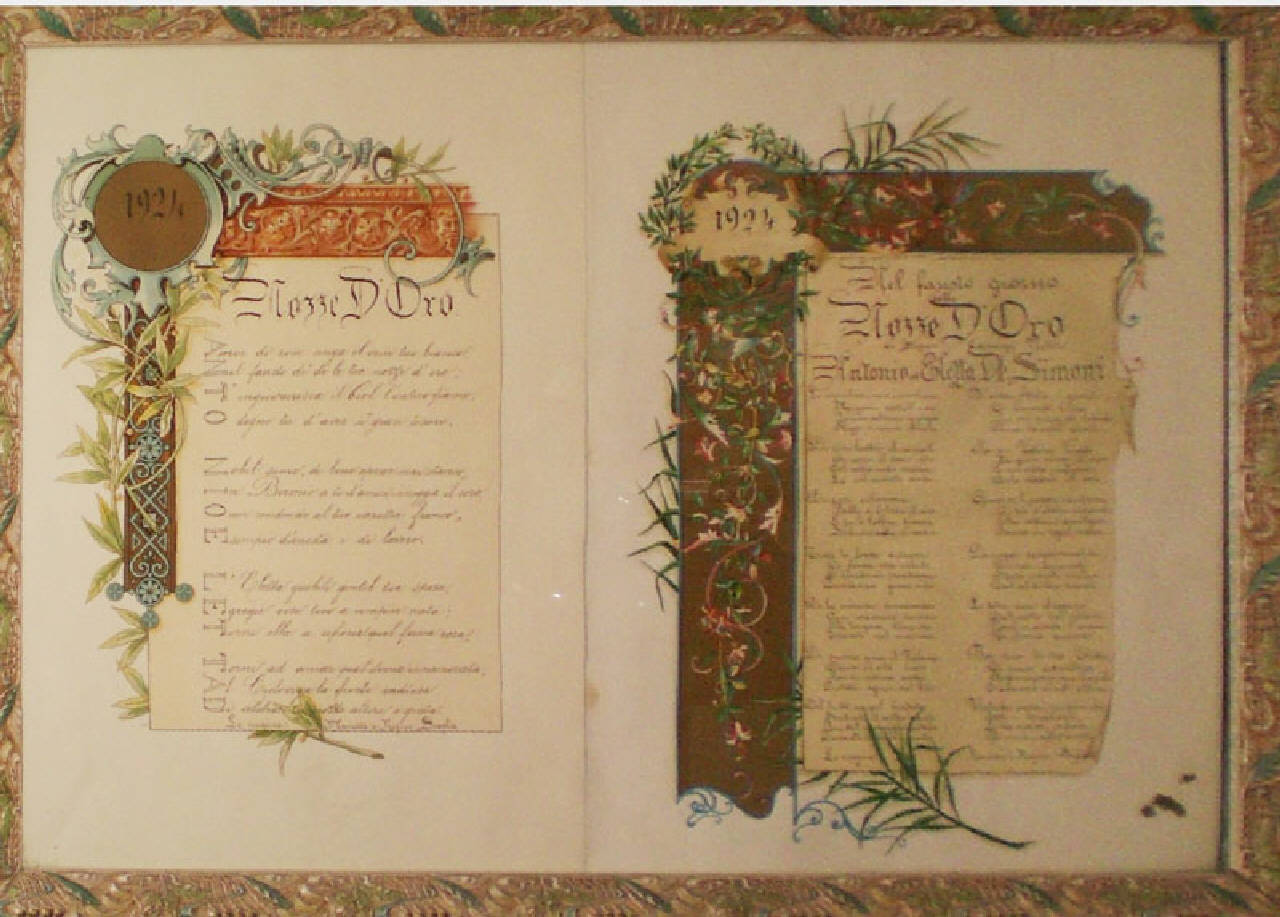 Due manoscritti affiancati e incorniciati sotto vetro.\nEntro cornice molto decorata, intagliata a racemi, con foglie colorate di verde e fiori, vi sono i due manoscritti con ode per le nozze d'oro di Eletta ed Antonio De Simoni. 1924.