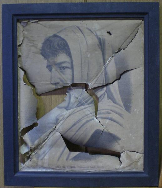 Litografia su carta di formato retangolare, incollata su un secondo supporto cartaceo e spago. Inserita in cornice di legno sagomata e dipinta di nero.