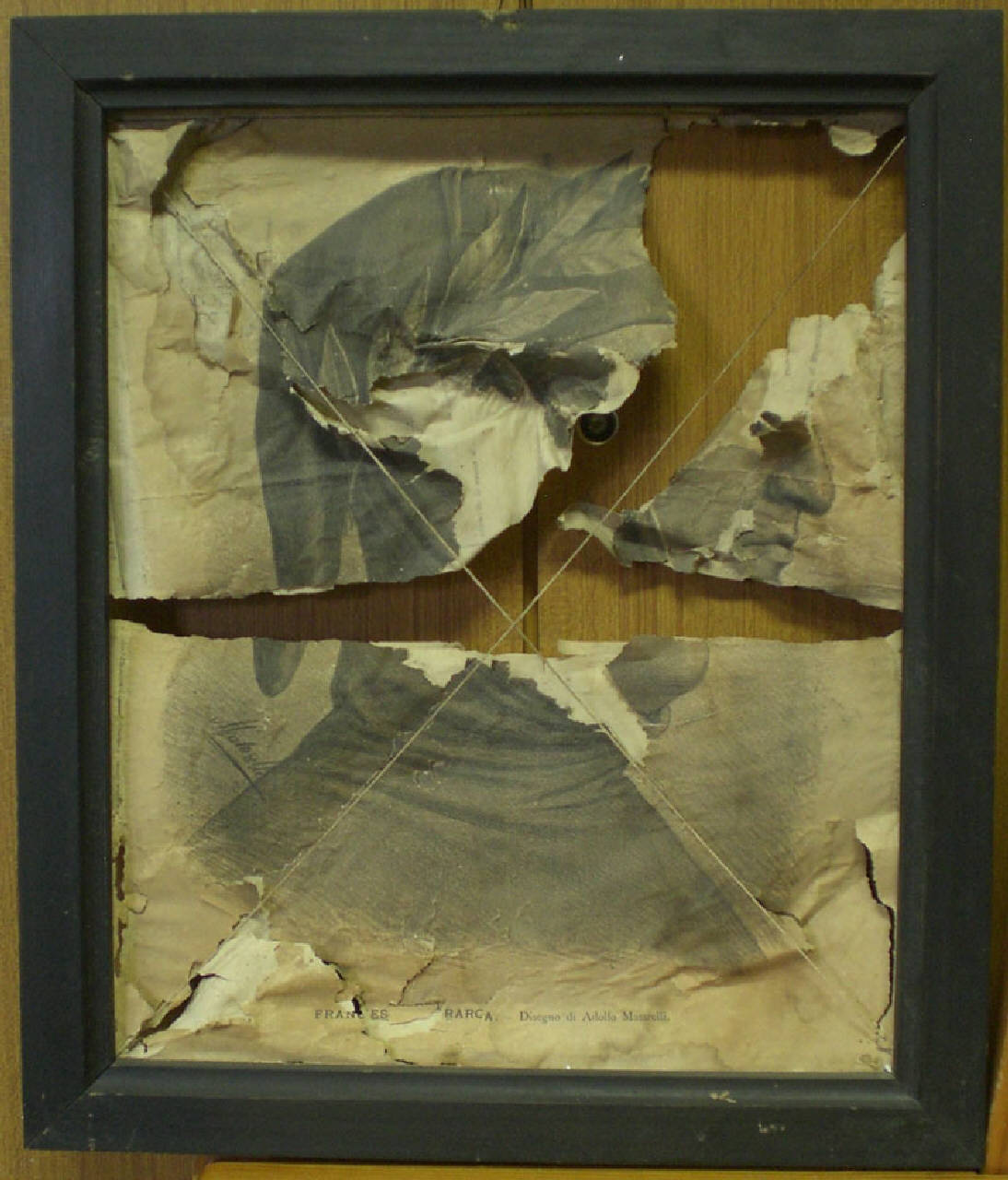 Litografia su carta di formato retangolare, incollata su un secondo supporto cartaceo e spago. Inserita in cornice di legno sagomata e dipinta di nero.