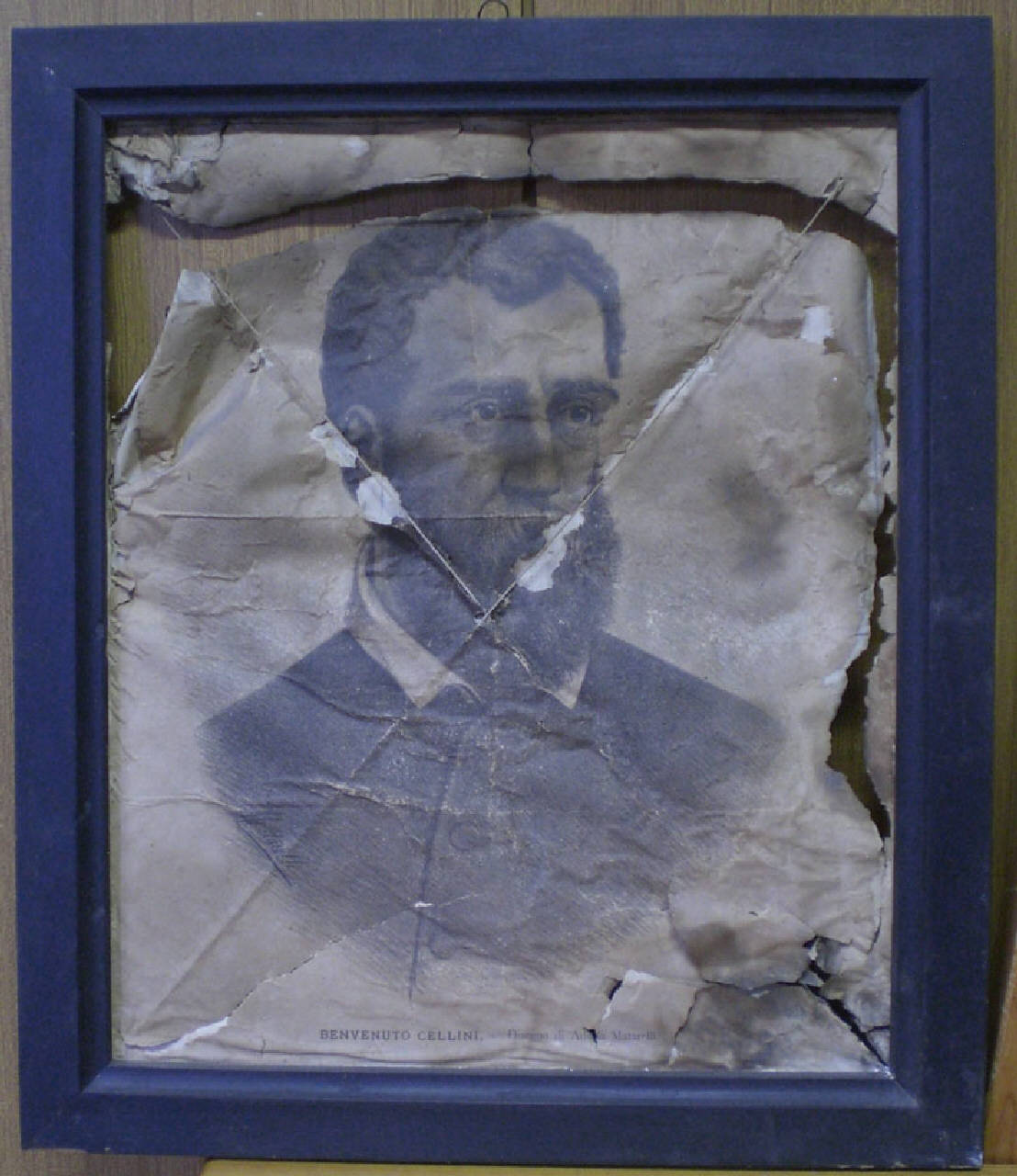 Litografia su carta di formato retangolare, incollata su un secondo supporto cartaceo e spago. Inserita in cornice di legno sagomata e dipinta di nero.