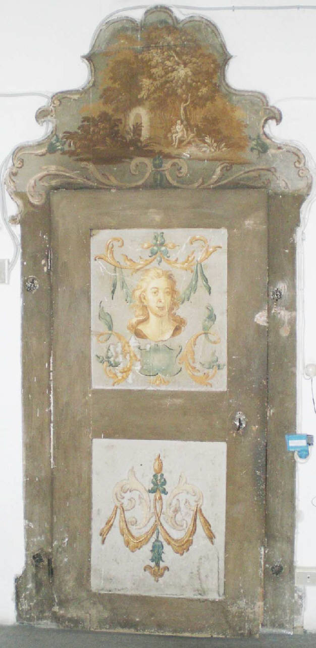 Porta a un battente, con perimetro dipinto grigio e due specchiature a fondo azzurro-grigio, la superiore con una testa femminile a monocromo con lunghi capelli, tra racemi vegetali verdi e dorati. Specchiatura inferiore con ghirlanda vegetale e racemi.