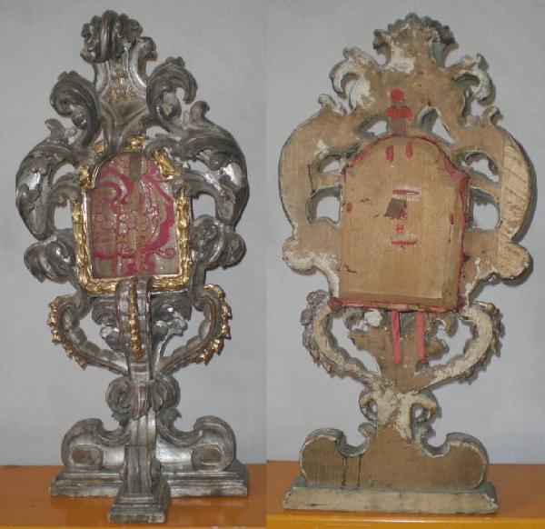 Reliquiario a ostensorio in legno intagliato, dorato e dipinto. Composto da base con zoccolo madanato e tre volute schiacciate; teca centrale rettangolare e centinata, rivestita di stoffa rossa e oro e coperta da vetro, con cornice dorata; attorno alla teca ricche volute fogliacee argentate. Sul retro sigilli in cera rossa, in parte divelti.