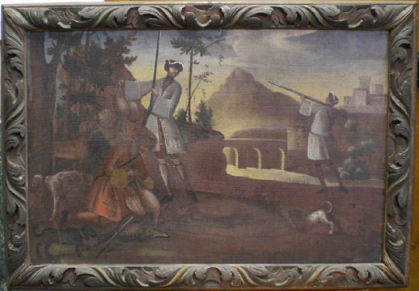 Dipinto rettangolare su tela, incorniciato con cornice modanata e intagliata a foglie accartocciate.