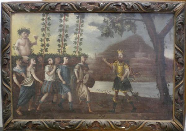 Dipinto rettangolare su tela, incorniciato con cornice modanata e intagliata a foglie accartocciate.