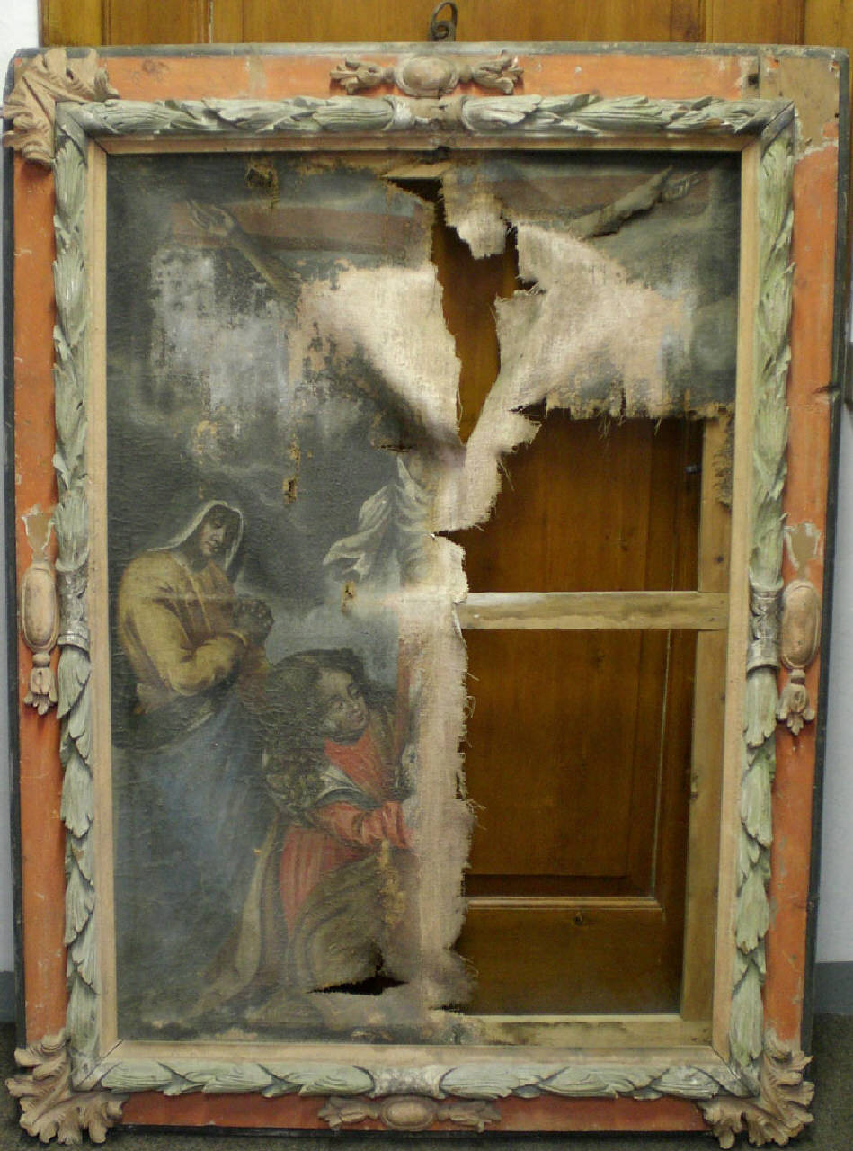 Dipinto rettangolare su tela, incorniciato con doppia cornice modanata e intagliata a foglie sovrapposte, cartocci in corrispondenza degli spigoli e scudi ovali con pennacchi vegetali posti sulla mezzeria di ogni lato. Bordo esterno della cornice dipinto di rosso, quello interno intagliato verdino; elementi aggiuntivi dipinti con colore chiaro.