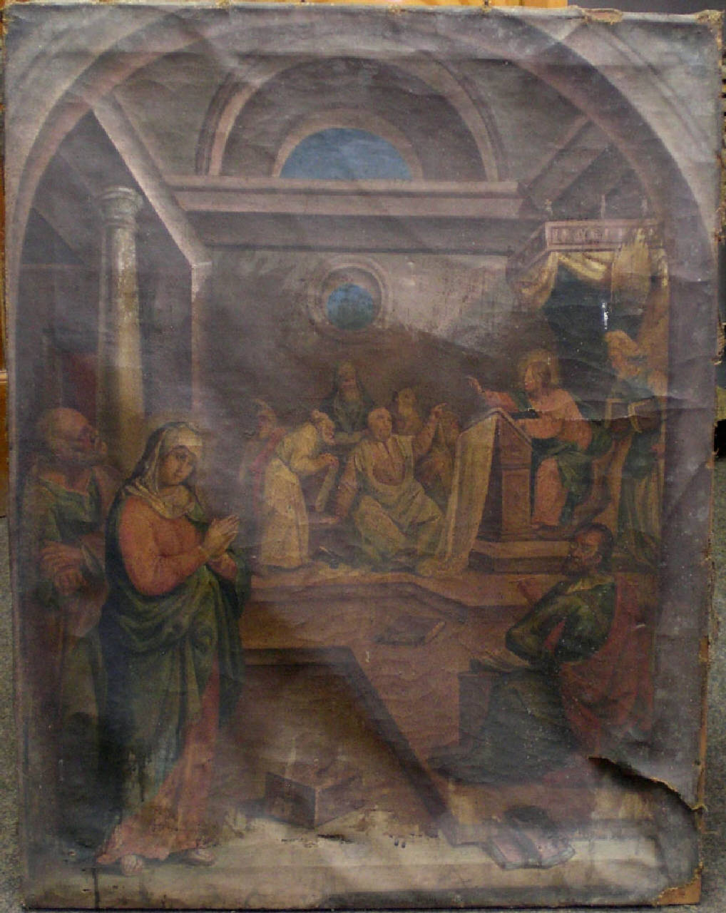 Dipinto a olio su tela, di forma rettangolare, senza cornice. La lettura dell'immagine è resa difficile dal cattivo stato di conservazione.