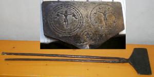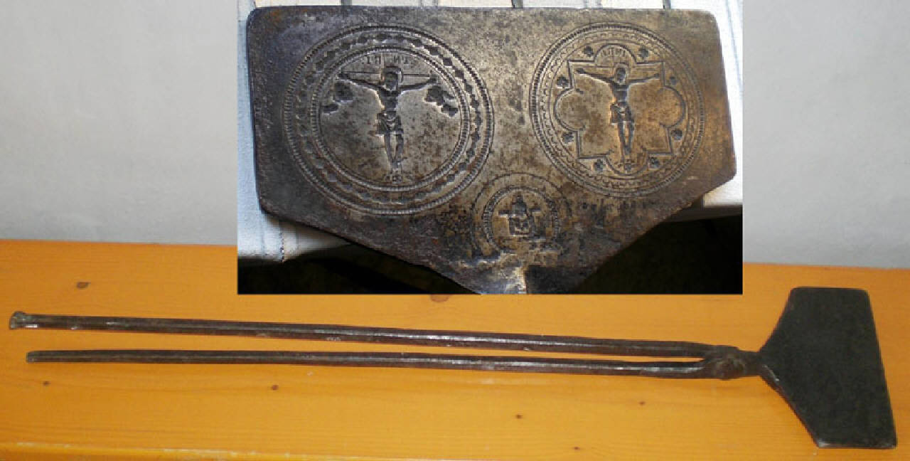 Stampo per ostie in ferro composto da due piastre rettangolari agganciate a due lunghi manici incernierati. All'interno di uno dei due piatti sono incisi tre stampi circolari, due laterali più grandi e uno centrale più piccolo nello spazio di risulta in basso. Le figure sono incise per consentire la stampigliatura delle ostie.