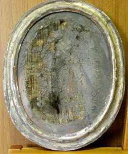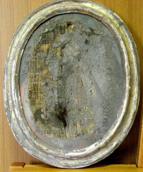 Dipinto a olio su tela, di forma ovale, con cornice modanata e dorata. La lettura dell'immagine è impedita dallo stato di conservazione dell'opera.