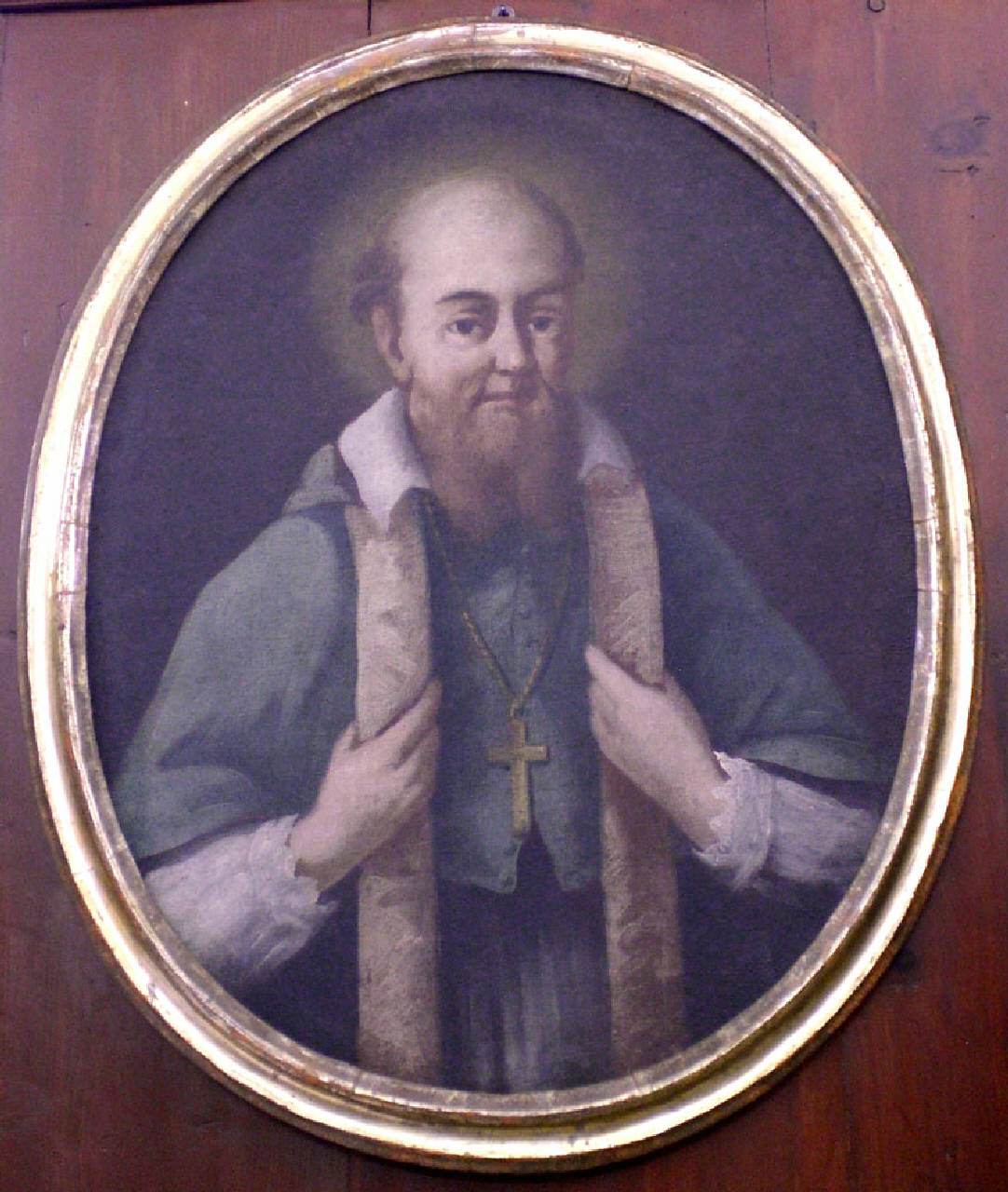 Dipinto a olio su tela, di forma ovale, con cornice modanata e dorata.
