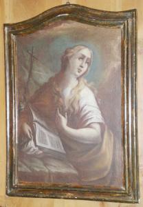 Oggetto rettangolare con lato superiore curvo. Dipinto su tela, incorniciato con cornice modanata e argentata.