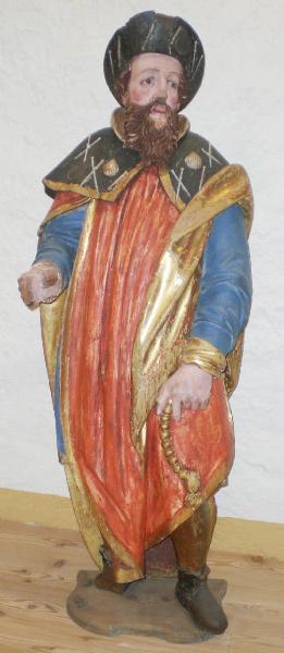- NOTIZIE STORICO CRITICHE Statua in legno scolpito e dipinto, risalente al secolo XVI. La fattura denuncia evidenti tratti nordici. Nel mese di settembre 2006 si è staccata parte del braccio destro: la parte aveva subito precedentemente un rudimentale intervento di recupero, in epoca non segnalata. Il piede sinistro ha subito un grossolano intervento di recupero in epoca non definita. Manca completamente una parte dei grani del rosario che il santo regge con la mano sinistra, mentre sulla cappa è andata persa una conchiglia; sul copricapo mancano una conchiglia e due spade, mentre la parte centrale del cappello presenta al centro una caduta di una piccola parte di legno. Il santo raffigurato è S. Giacomo Maggiore a Santiago de Compostela. Gli attributi che normalmente definiscono questo santo sono: la conchiglia (in origine simbolo dei pellegrini a Santiago de Compostela e poi divenuto pure attributo del santo), le spade simbolo del martirio, il cappello a larghe falde ed il mantello. La tradizione medievale vuole che S. Giacomo si recasse in Spagna come missionario e che venisse sepolto a Compostela.\nIl retro della statua è appiattito e intagliato sommariamente, elementi che indicano la collocazione della statua all'interno di una nicchia o in uno spazio ristretto di un'ancona o macchina d'altare, non destinata ad una visione solo frontale.