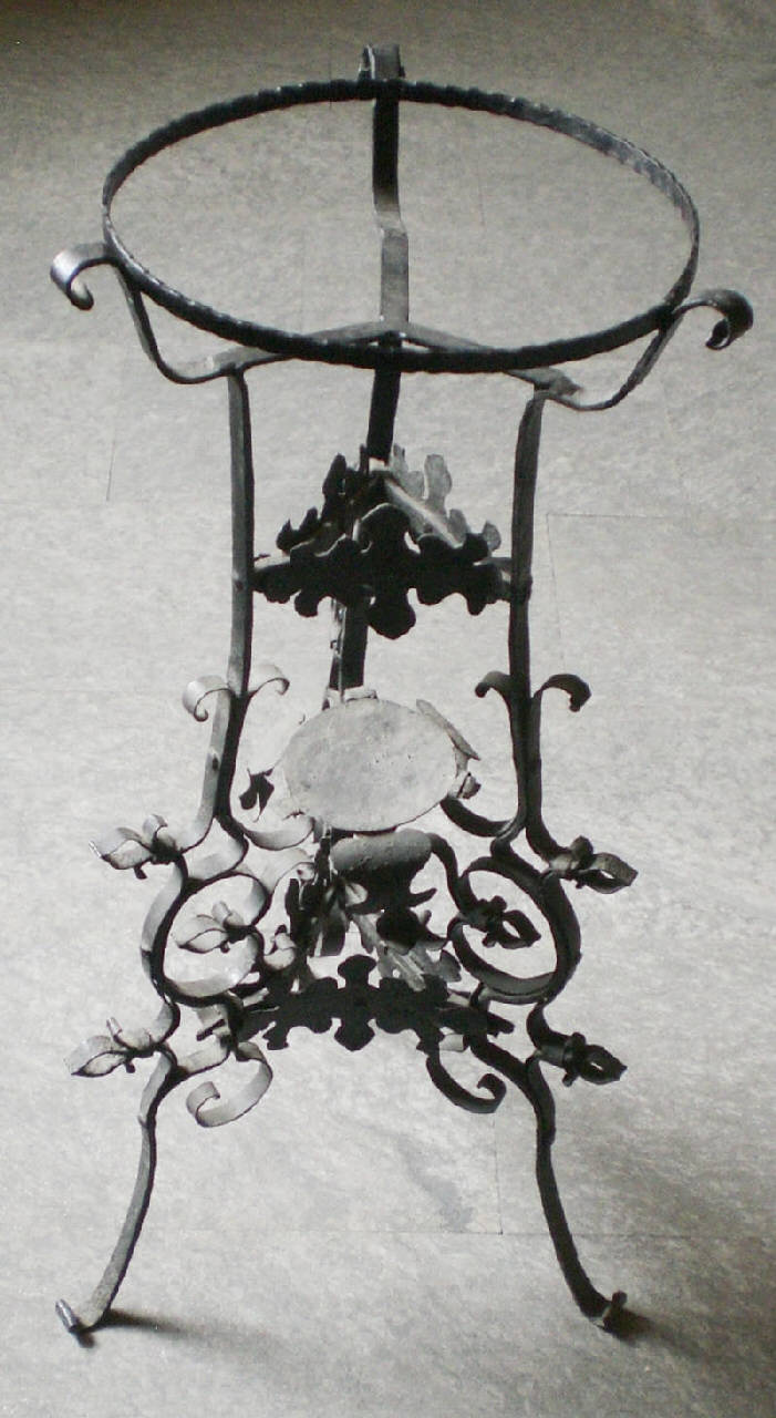 Struttura in ferro battuto dipinta di nero, costituita da tre piedi lavorati con volute e fogliami; a cm 42.5 dal suolo vi è un disco in ferro battuto di cm 11 di diametro che funge da portavaso. Sopra ci sono tre lamine ritagliate con andamento mistilineo in funzione di abbellimenti, connesse ai tre piedi. All'apice tre ulteriori bracci terminanti a voluta delimitano un cerchio, sempre in ferro battuto, destinato a contenere vasi o catini.