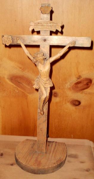 Scultura in legno intagliato, costituita da un basamento quasi circolare con decorazione floreale stilizzata incisa, sul quale si innesta una croce decorata alle estremità longitudinale e a quella di sinistra con piccoli fuiori intagliati e incisi. Alla croce è appeso il corpo di Cristo, intagliato a tutto tondo, con il capo reclinato in avanti sulla sinistra e le ginocchia piegate e rivolte verso destra. Poco sopra l'incrocio dei bracci della croce è apposto un cartiglio con le lettere INRI incise.