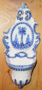 Piccola acquasantiera in porcellana da appendere al muro, composta da una vaschetta semicircolare e da una specchiatura mistilinea. Di colore bianco smaltato, presenta sulla specchiatura decolazioni a volute a rilievo ripassate di blu a pennello, che fanno da cornice ad un ovale centrale contornato da tante perline, all'interno del quale si staglia, tra ramoscelli, una piccola croce con raggi che fuoriescono dall'incrocio dei bracci. Anche gli elementi a rilievo della vasca sono ripassati in blu, in particolare il bordo, la baccellatura alla base e il semi-pomolo terminale.