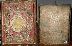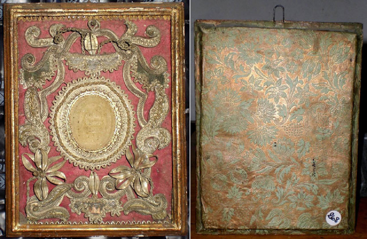 Agnus Dei costituito da una cornice di legno dorata, da un fondo in stoffa rossa lavorata su cui sono applicati galloni metallici disposti a voluta e due fiori di stoffa, in tutto disposto attorno ad un ovale centrale bordato di passamanerie contenente un disco di cera impressa con l'immagine dell'Agnello sacrificale e una scritta che corre lungo i bordi. Il retro del quadretto è tamponato con cartoncino colorato che finge un tessuto, con fiori azzurri su fondo color bronzo.