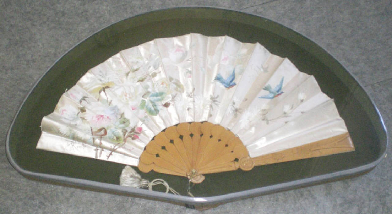 Ventaglio di seta bianca dipinta, con due rondini azzurre che volano tra rametti di fiori colorati. L'impugnatura è costituita da bacchette piatte di legno sagomato, di cui la prima e l'ultima intagliate con elementi vegetali stilizzati e un tondo con cammeo. Le bacchette sono tenute insieme da un anello di metallo dal quale pende un cordone grigio con fiocco. L'oggetto è inserito dentro una teca con vetro.