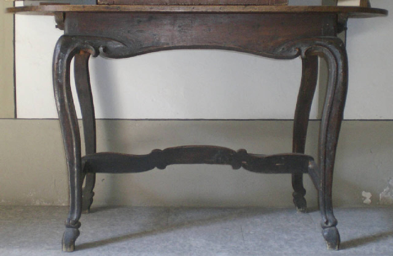 Tavolo a muro di legno poggiante su 4 gembe leggermente ricurve e terminanti a forma di zampa e collegate tra loro con assicelle intagliate in maniera molto semplice. Il piano è di forma semicircolate. Il tutto è verniciato con colore scuro.