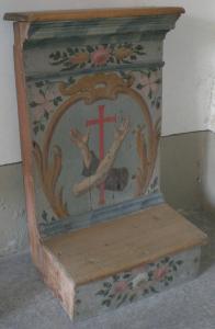 Inginocchiatoio di legno dipinto. Il gradino di appoggio per le ginocchia mostra sulla parte anteriore una decorazione con rose bianche e rosa. L'alzata rettangolare è decorata con finta cornice ovale dorata, con palmette laterali e cartiglio all'apice; al centro una croce rossa con il braccio nudo di Cristo che si incrocia con quello, provvisto di saio e mano stigmatizzata, di San Francesco; negli spazi di risulta esterni alla finta corniceramoscelli con due grandi fiori rosa. Sopra, fregio con tre rose e cornice modanata marezzata grigio-azzurra. Colore di fondo grigio-azzurro.