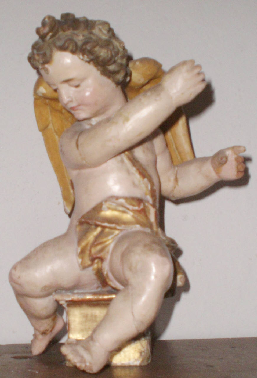 Scultura a tutto tondo, in legno intagliato, dipinto e in parte dorato. Rappresenta un angioletto seduto du un cubo dorato, con il viso rivolto a sinistra, le gambe divaricate e le braccia rivole a destra nell'atto di reggete qualcosa (un'asta, una croce ?). Viso paffuto e folta capigliatura marrone con ricciolo rialzato sulla fronte; un panno dorato avvolge la vita.