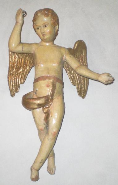 Scultura a tutto tondo, in legno intagliato, dipinto e in parte dorato. Rappresenta un angioletto in volo, con il viso rivolto a sinistra, le gambe distese e incrociate, il braccio destro piegato al gomito e rivolto verso l'alto, il sinistro disteso e con il palmo aperto verso l'alto. Viso paffuto e capigliatura a ondine. Una cinturina dorata sopra l'ombelico cui è appeso un panno dorato. Ali dorate. Nella mano destra è conficcato un anello di ferro, che doveva servire per reggere qualcosa.