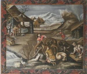 Dipinto a olio su tela, di forma rettangolare, in cornice di legno intagliata con fogliette accartacciate e dipinta. La tela rappresenta una scena ambientata in un piccolo paese lambito da un ruscello, con figurine intente ad attività legate alla raccolta/ trasporto della legna, con un asino e un cane al centro; scena conviviale in alto a sinistra. Sullo sfondo montagne e cielo grigio.