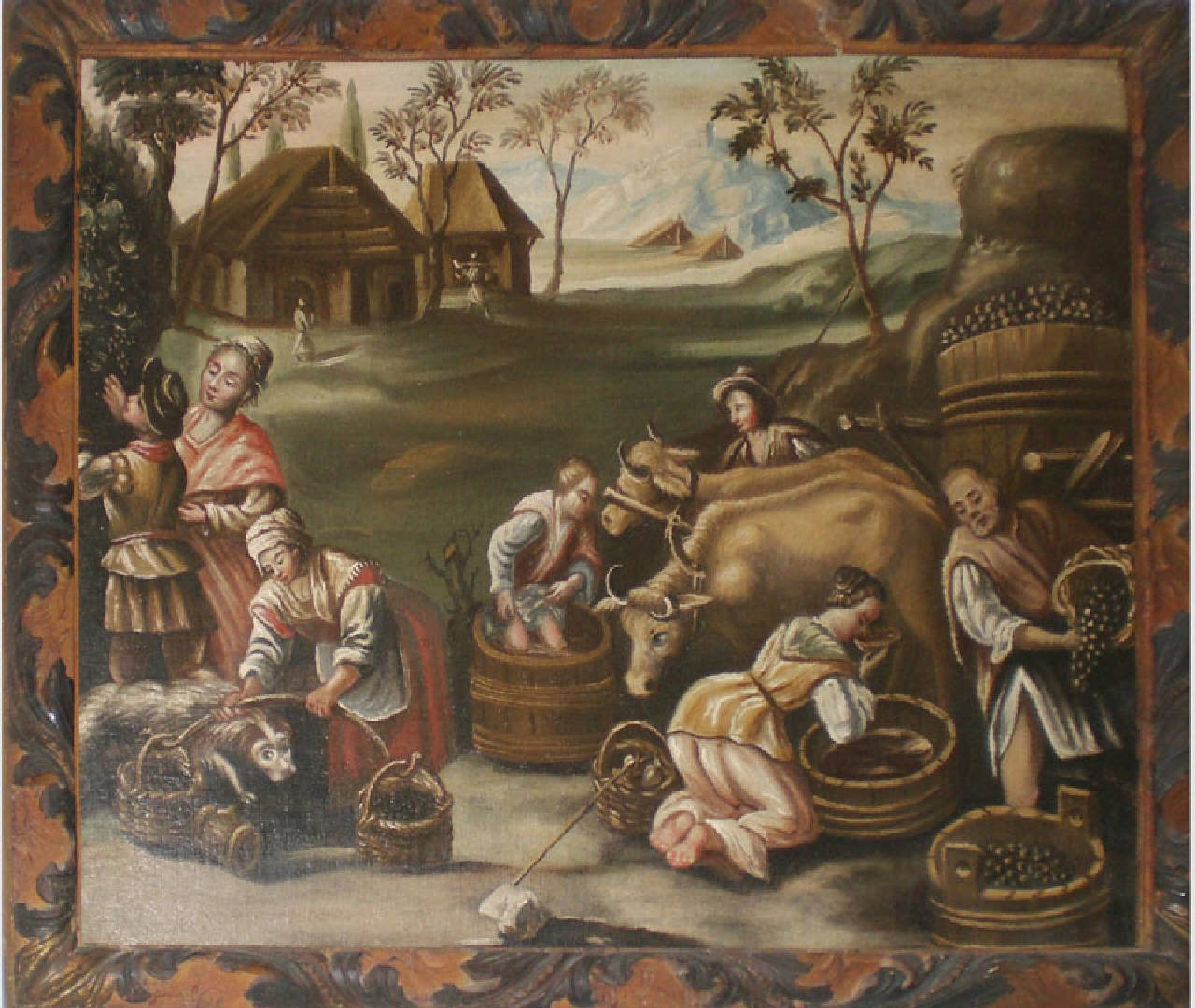 Dipinto a olio su tela, di forma rettangolare, in cornice di legno intagliata con fogliette accartacciate e dipinta. La tela rappresenta una scena ambientata ai margini di un piccolo paese, con persone che raccolgono l'uva, la pigiano, la trasportano con i buoi, la mettono in vari cesti e contenitori, assaggiano il frutto della spremitura.