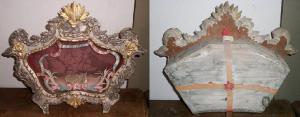 Reliquiario simile ad una cartagloria, in legno intagliato dipinto e argentato, con fusarola attorno alla teca, palmette centrali e due rose laterali dorate. La cornice è intagliata a cartocci con due piedini di sostegno. Teca mistilinea, rivestita di stoffa bordeaux, contenente reliquie ossee accompagnate da scritte su carta bordata di verde e rosso, e palmette; chiusa da vetro originale. Sul retro la teca è chiusa da due strisce di stoffa rossa incrociate, con 5 sigilli rossi in ceralacca posti alle estremità e all'incrocio delle fettucce; quattro ganci in metallo tengono la cassa ancorata alla cornice. All'interno c'è un cuscino decorato con un gallone argentato, sul quale poggiano le reliquie.