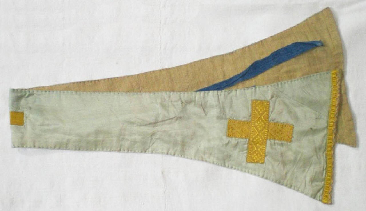 Manipolo in seta color verdeacqua, con passamanerie dorate che ornano i bordi e disegnano tre croci, due alle estremità e una centrale. Fodera di lino giallognolo. Due nastri interni blu.