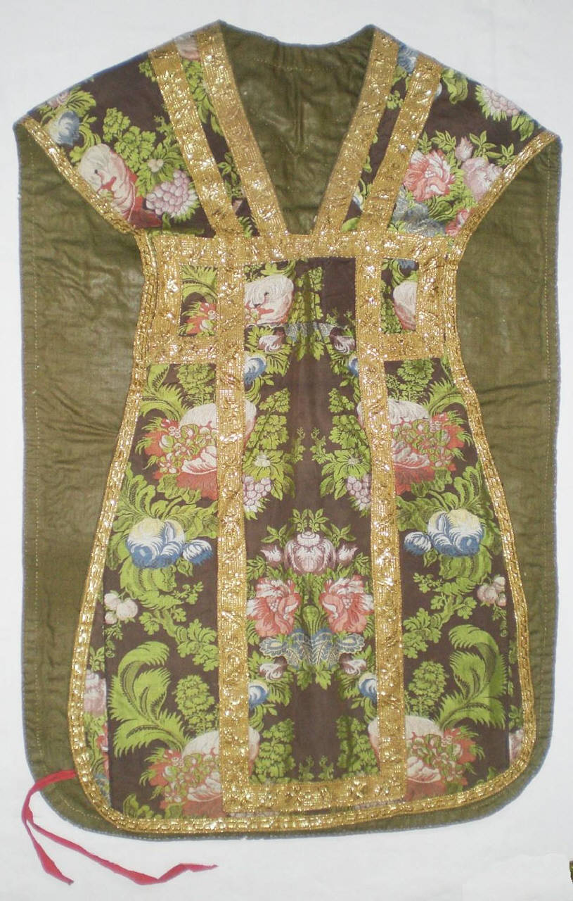 Pianeta in seta operata con fondo marrone con decorazioni floreali a mendro composte da vaporosi fiori rosa e azzurri e da vivaci foglie verdi. Lungo i bordi passamanerie dorate che disegnano una croce sul recto. Fodera di lino verde con nastri rossi.