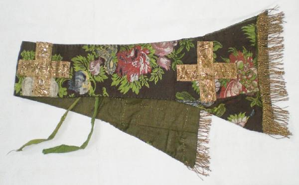 Manipolo in seta operata con fondo marrone con decorazioni floreali a mendro composte da vaporosi fiori rosa, rossi e azzurri e da vivaci foglie verdi. Passamanerie dorate disegnano tre croci, due alle estremità e una centrale, frange dorate terminali. Fodera di lino verde. Due nastri interni verdi. Composto da più pezzi di tela cuciti insieme.