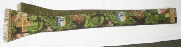 Stola composta da più pezzi di tela cuciti insieme, in seta operata con fondo marrone con decorazioni floreali a mendro composte da vaporosi fiori rossi e azzurri e da vivaci foglie verdi, con passamaneria dorata che forma tre croci greche, due alle estremità e una centrale. Frangia metallica dorata. Fodera interna in lino verde.