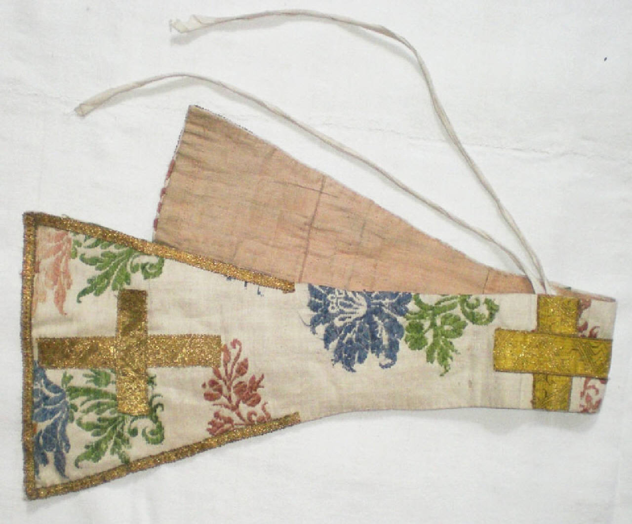 Manipolo in seta con fondo bianco e disegno lanciato composto da singoli fiori rossi o blu con ramoscello verde alternati. Lungo i bordi delle terminazioni, passamanerie dorate che disegnano una croce al centro e due terminali. Fodera di lino rosa. Due nastri bianchi.