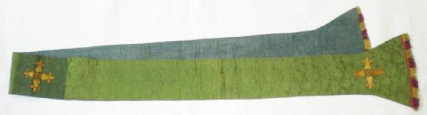 Stola in damasco verde con piccoli disegni floreali. Al centro e alle terminazioni sono applicate tre croci gigliate gialle bordate di filo bordeaux. Lungo i bordi terminali vi sono frange di colore giallo e bordeaux alternati. Fodera in lino verde petrolio.