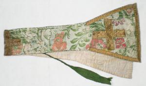 Manipolo in seta con fondo bianco e disegno a fiori rosa con alcune aggiunte gialle e blu e sinuosi rametti con foglioline verdi. Lungo i bordi sono applicate passamanerie dorate, che disegnano anche tre croci, una al centro e due nelle terminazioni. Fodera di lino bianco con nastri verdi.