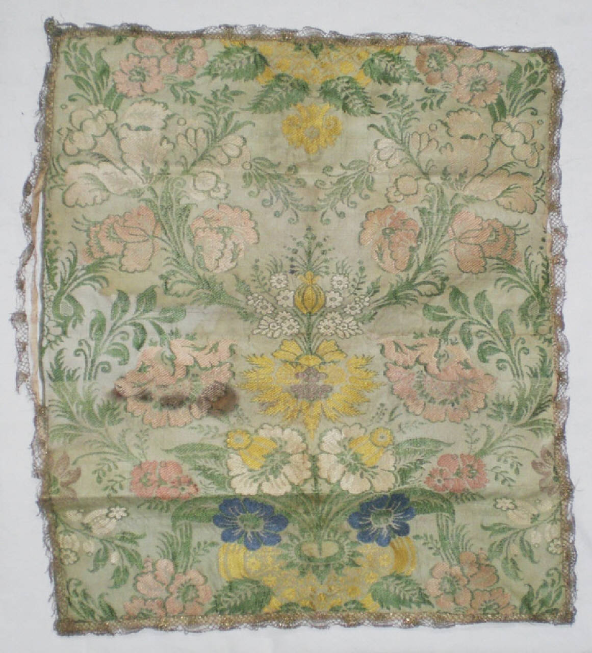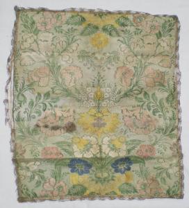 Velo in seta con fondo bianco e disegno a fiori rosa articolati attorno a rami di fiori gialli bianchi e blu, con sinuosi rametti con foglioline verdi. Lungo il bordo è applicato un gallone metallico dorato.