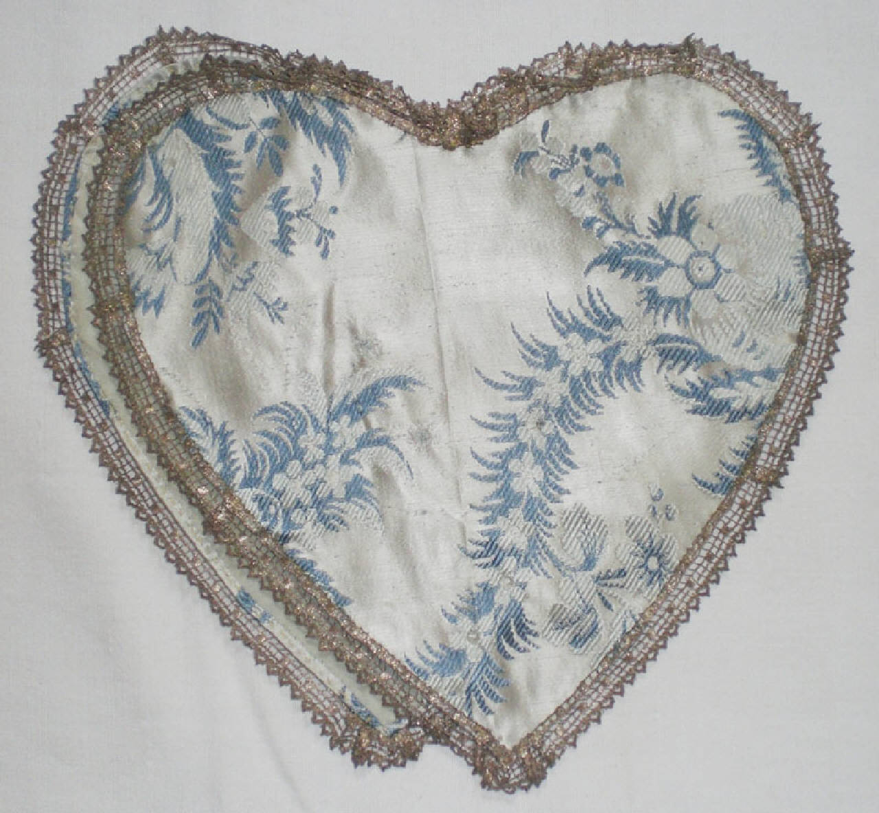 Borsa a forma di cuore composta da due parti cucite insieme solo nella parte alta. I due cuori sono in seta con fondo bianco e disegni floreali azzurri. Lungo i bordi sono applicati galloni argentati. Fodera interna bianca.