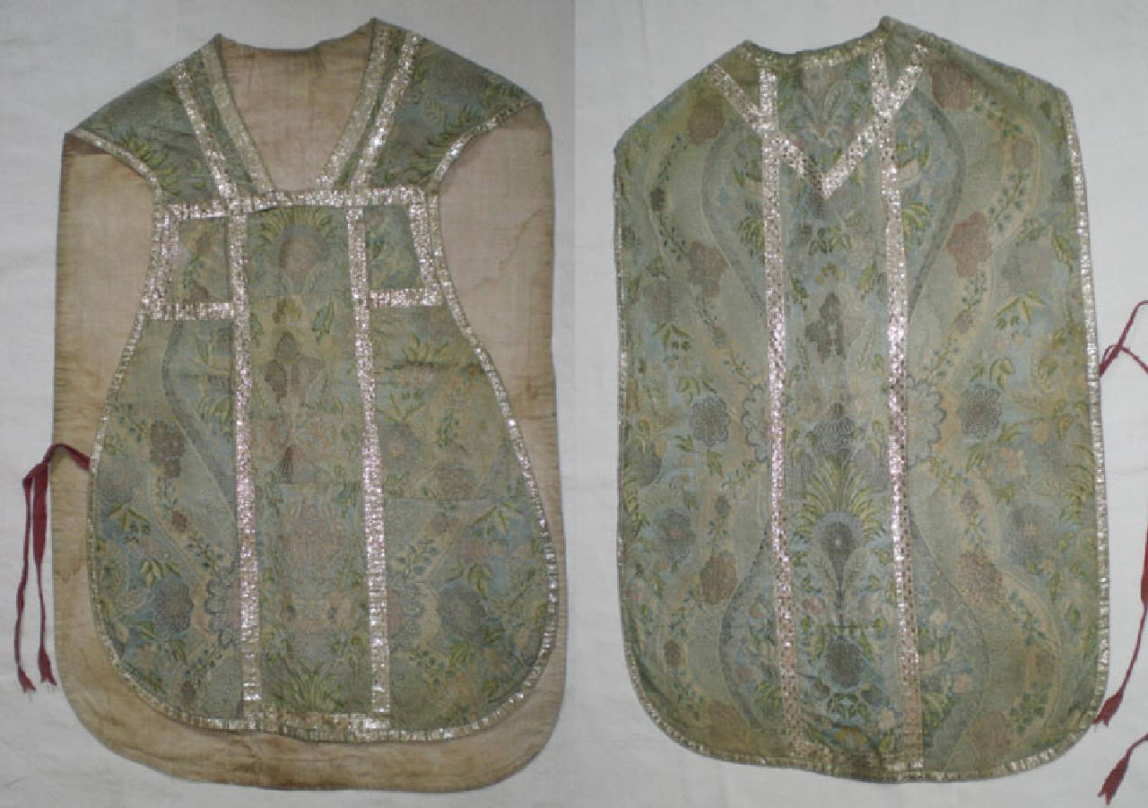 Pianeta in seta con fondo azzurro e disegno a fiori bianchi rosa e azzurri e ghirlande sinuose, foglioline verdi e palmette. Lungo i bordi sono applicati galloni argentati, che disegnano una croce sul recto. Fodera di lino bianco con nastri bordeaux.