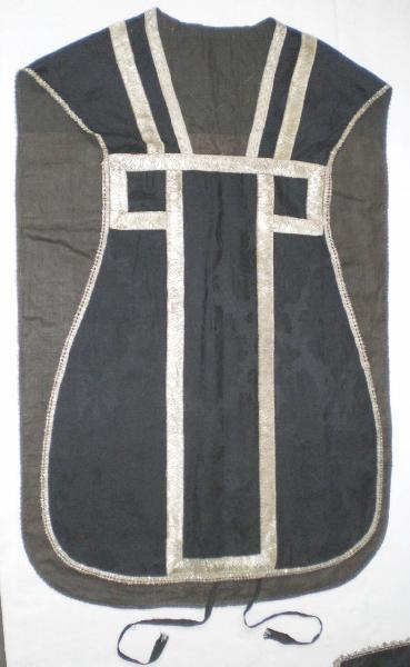 Pianeta in damasco nero. Lungo i bordi sono applicate passamanerie argentate, che disegnano una croce sul recto. Fodera di lino nero con nastri neri.