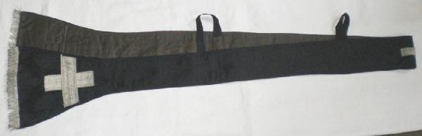 Stola in damasco nero. Passamaneria argentata disegna una croce al centro e due nelle terminazioni. Frange argentate applicate alle terminazioni. Fodera di lino nero; due fascette nere.