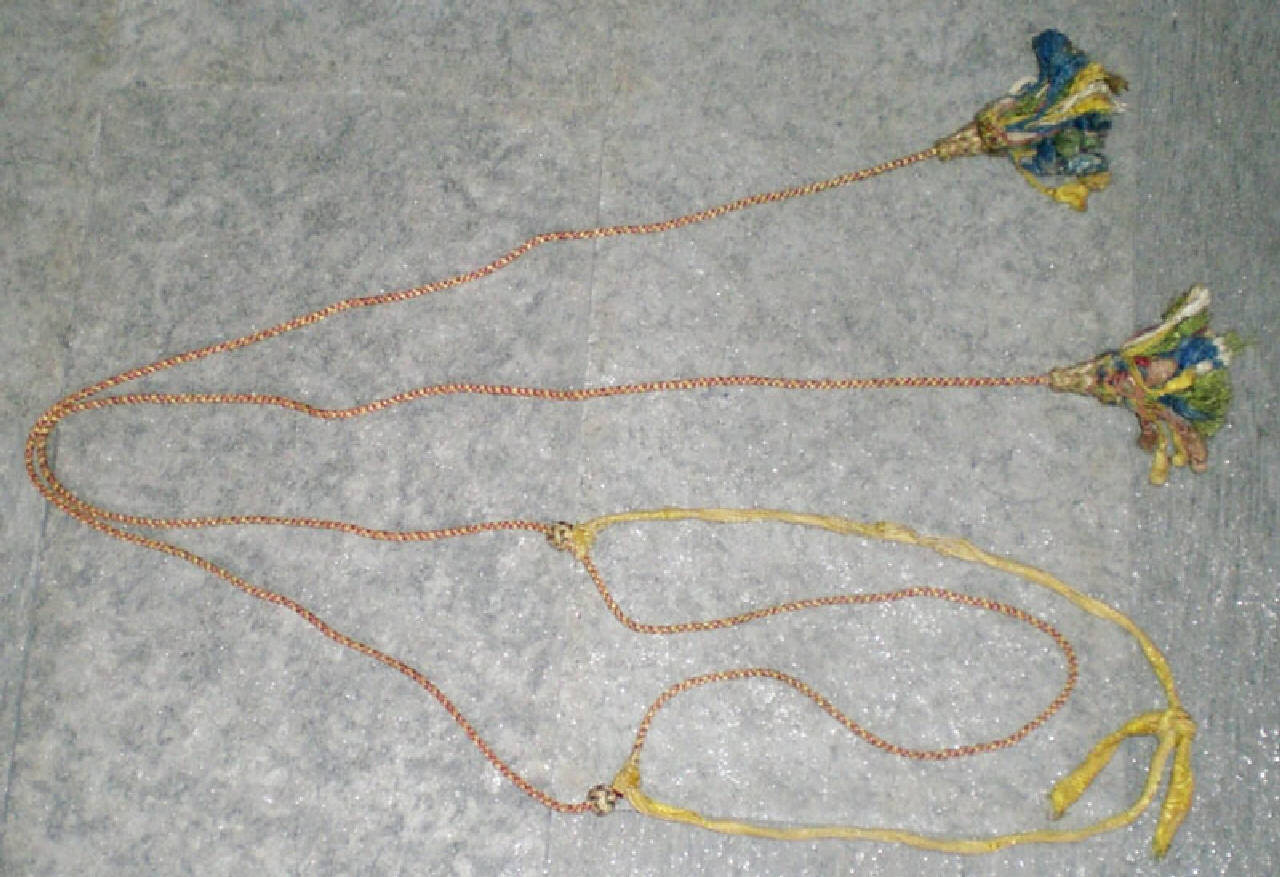 Cingolo giallo e rosso con nappe colorate alle estremità. Vi è annodato in due punti un altro nastro giallo.