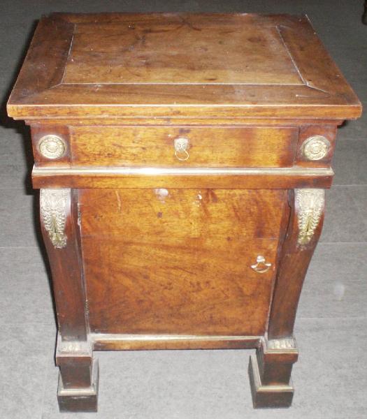 comodino in legno, provvisto di cassetto e vano richiudibile con un'antina. la parte frontale è incorniciata alle astermità laterali da due salienze in legno che si pegano all'indietro a voluta nella parte alta. La parte alta delle salienze è decorata con due elementi fogliacei in ottone. due piccoli rosoni in ottone sono posti lateralmente al cassetto; questo è decorato al centro con una piccola testa di leone da cui pende la maniglia per aprire il cassetto.