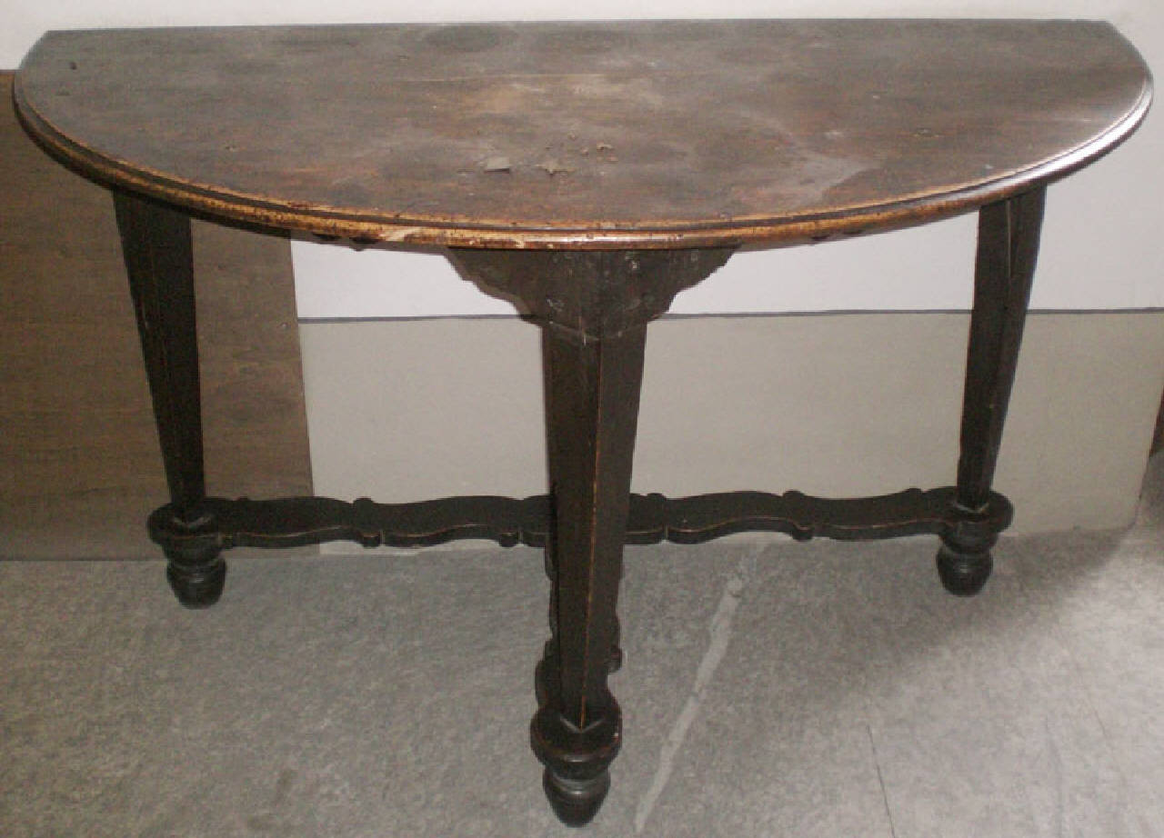 Tavolo di legno poggiante su 3 gembe a tronco di piramide rovesciata, impostate su piedi torniti e collegate tra loro con assicelle ondulate, connesse al centro da una pigna. Il piano è di forma semicircolare.