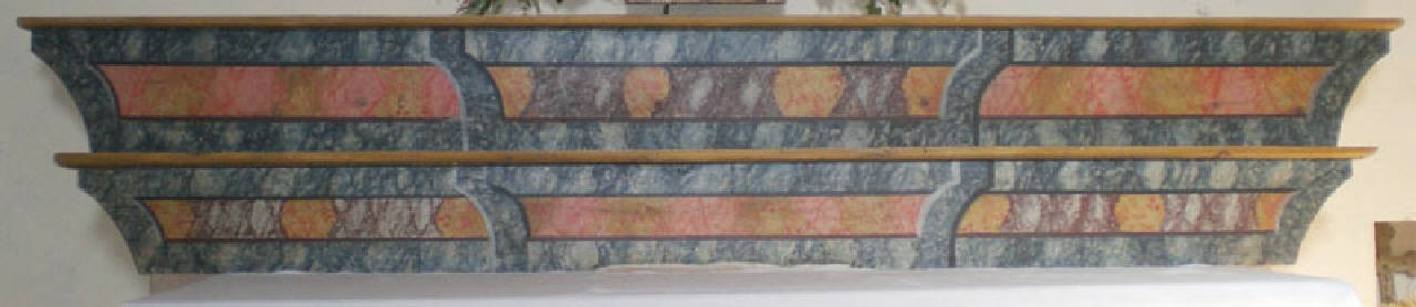 Gradino d'altare a doppio ripiano, in legno sagomato e dipinto a finti marmi, grigio per i bordi, rosato per le specchiature, tre per ripiano, in cui risulta illusionisticamente spartito.