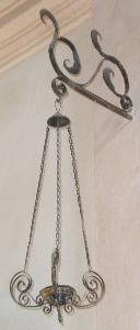 Lampada pensile in ferro battuto, composta da anello apicale, piattello di raccordo delle tre catenelle di sospensione agganciate a tre manici a voluta, che si raccordano al centro sostenendo la tazza.