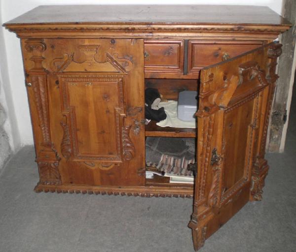 Mobile in legno, a due ante decorate con cartella architettonica a T bordata lateralmente da due volute fogliacee, con cimasa a timpano spezzato in due punti. L'anta di destra è provvista di serratura e chiave. Ai lati e al centro della parte frontale del mobile vi sono tre lesene rastremate verso il basso, poggianti su plinti fogliacei e con capitelli corinzi. All'interno, il mobile presenta tre cassetti con maniglie in ferro e una mensola nella parte mediana che genera a tutta larghezza due spazi dove riporre eventuali oggetti.