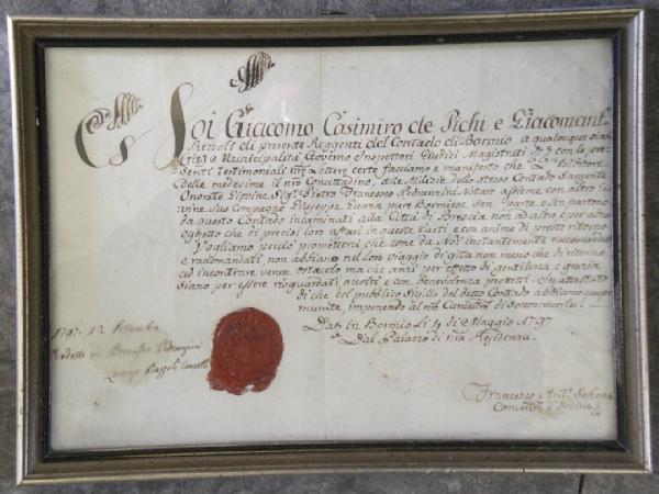 Salvacondotto cartaceo rilasciato dai Sigg. Giacomo Casimiro de Pichi e Giacomoantonio Rezzoli, reggenti del Contado di Bormio, nell' anno 1797, a Pietro Francesco Pedranzini, notaio. In basso a sinistra, il sigillo in ceralacca, rosso, del COMITATUS BURMII.\nIl documento è inserito in cornice di legno modanata e dipinta di nero, posto sotto vetro.