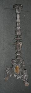 Candelabro ligneo intagliato con volute e decorazioni. Poggia su tre piedini. La superficie è quasi interamente dipinta di grigio.