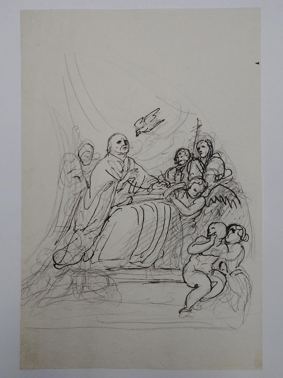 - NOTIZIE STORICO CRITICHE Il disegno presenta sul recto e sul verso del foglio due studi per il Dottore della Chiesa San Gregorio, raffigurato in una lunetta della cupola della chiesa di Santa Maria presso San Celso, affrescata da Appiani tra il 1792 e il 1795. Il disegno faceva parte della collezione privata di G. Vallardi che, intorno al 1820, ordinò in album ben 344 disegni di Appiani. L'album, di formato atlantico, pervenne all'Accademia di Brera nel 1875 per donazione di E. Cernuschi, allora residente a Parigi dove lo acquistò nel 1856-1860 (periodo in cui a Parigi si tennero aste di vendita di opere di provenienza Vallardi).