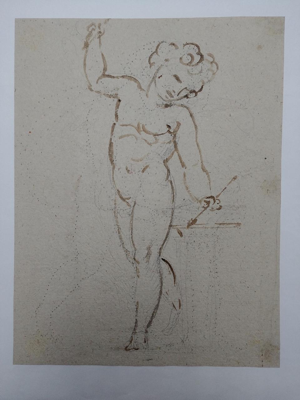 il disegno presenta dei piccoli fori lungo i contorni, suggerendo che il foglio sia stato utilizzato come matrice per la copia attraverso la tecnica dello spolvero.